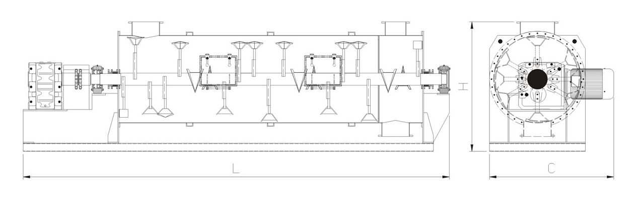 The Powder for Continuous Mixer consists of a horizontal drum, a twin-shaft mixing system, a drive unit, and infeed/discharge mechanisms. Its core mechanism achieves fluidized mixing through the three-dimensional motion of impellers/ribbons, and it is equipped with a variable frequency motor and adjustable baffles to precisely control residence time.