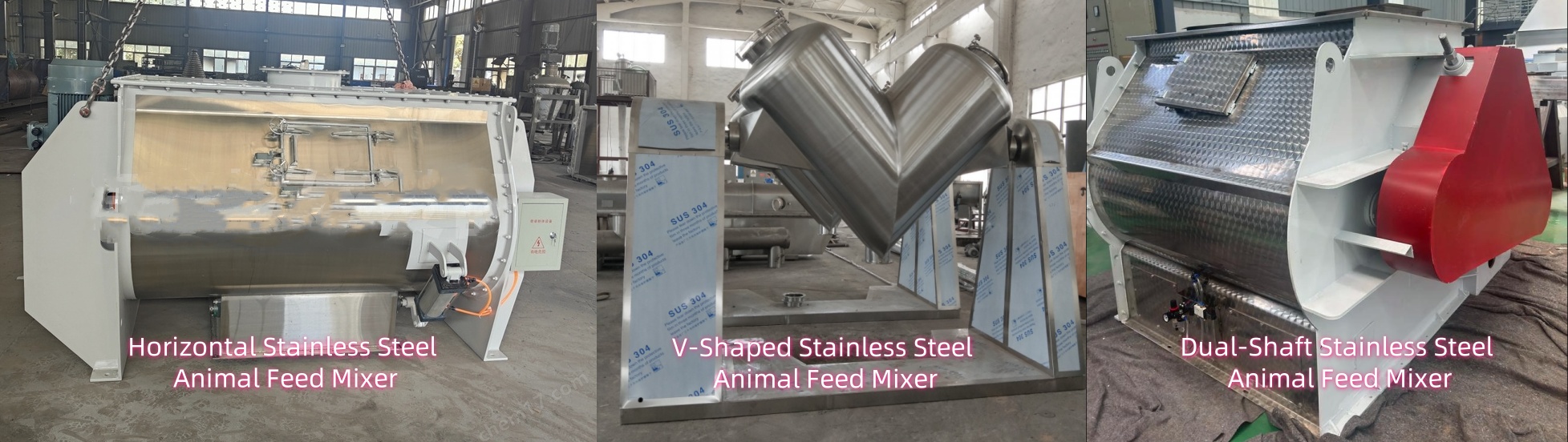 Dual-Shaft Stainless Steel Animal Feed Mixer: This mixer offers significant advantages in fast mixing speed and high uniformity. It utilizes a horizontal dual-shaft structure with specially angled impellers installed on both shafts. It achieves extremely high mixing uniformity in just minutes.