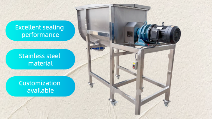 Single-ribbon Compound Seasoning Stainless Steel Ribbon Mixer: Utilizing a single spiral ribbon to push materials, it achieves axial circulation mixing. It is low-cost, easy to maintain, and suitable for seasoning production with small volumes, simple formulas, and moderate mixing requirements. The equipment has a small footprint and is easy to operate, making it suitable for small seasoning workshops and conventional powder mixing.