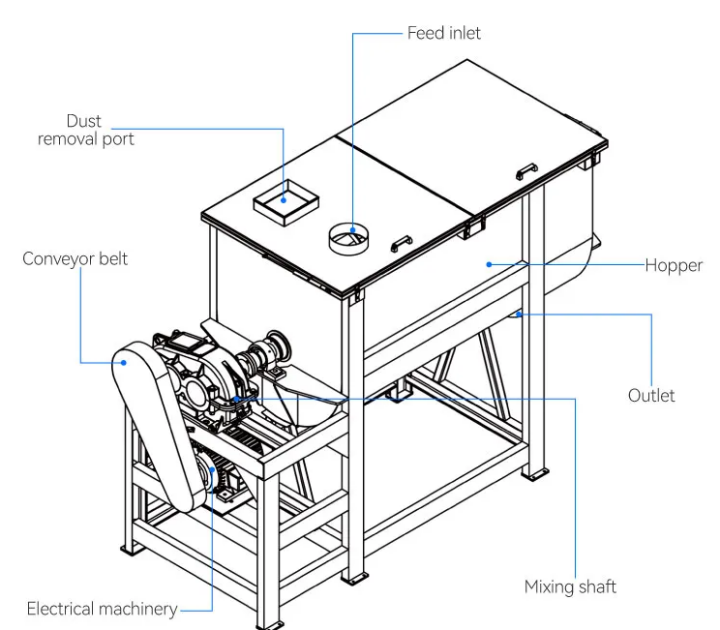 The horizontal shaft belt mixer for cattle feed is a horizontal integrated structure, consisting of four core parts: the main drum, the horizontal shaft mixing system, the transmission drive system, and the unloading control system.
