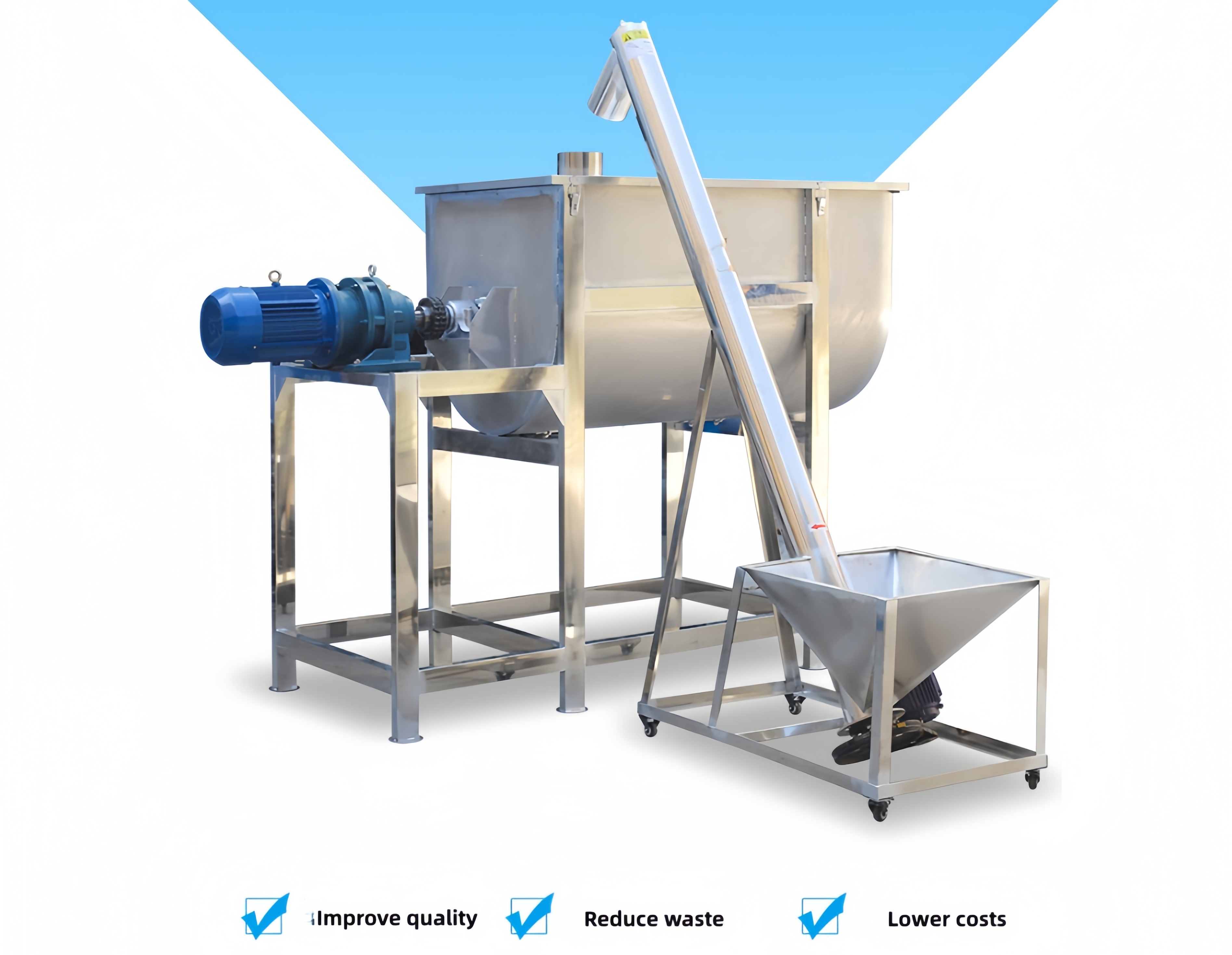 The core function of the Ribbon Mixer for Cattle and Sheep Feed is to improve the overall quality of cattle and sheep feed, ensuring a balanced distribution of various nutrients. This allows each animal to ingest sufficient protein, vitamins, minerals, and crude fiber, preventing growth differences and abnormal feed intake caused by uneven nutrient distribution. Simultaneously, uniform mixing maximizes the utilization of various feed ingredients, reducing waste and lowering farming costs.
