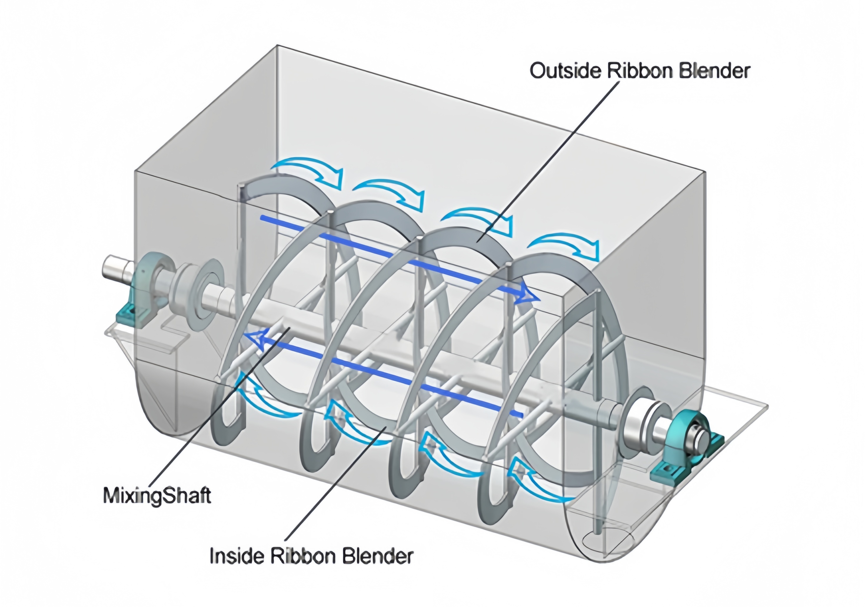 The Ribbon Mixer for Cattle and Sheep Feed operates based on the bidirectional rotation of the ribbon, which moves the raw materials. The motor drives the main shaft via the reducer, with the inner and outer ribbons rotating in opposite directions. The outer ribbon gathers feed from both sides of the chamber towards the center, while the inner ribbon transports feed from the center to both sides, creating a convective circulation of the raw materials. Simultaneously, the rotating ribbon shears and tumbles the raw materials, causing materials of different shapes and specific gravities to interweave and penetrate, breaking up clumps and ensuring uniform mixing.