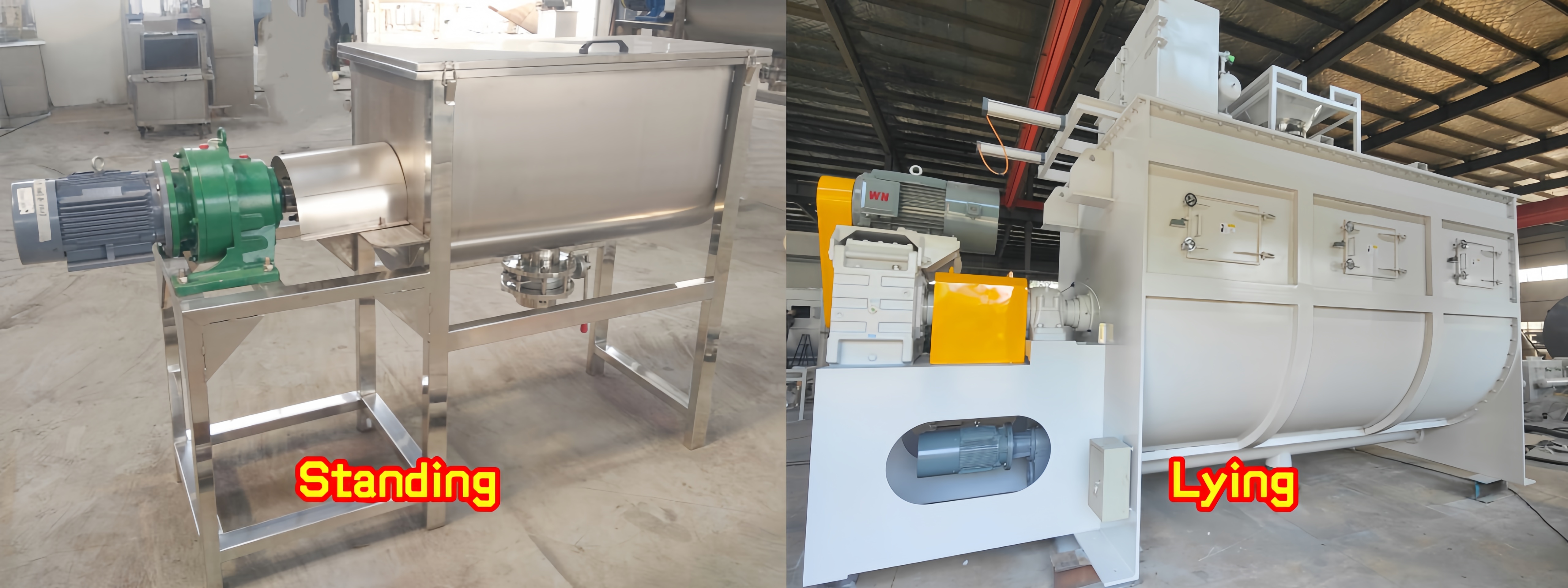 Horizontal Cattle and Sheep Feed Ribbon Mixer: This machine features a horizontal design without additional outriggers, allowing for direct ground installation and making it suitable for large-scale ranches and feed processing plants. Its elongated design provides a larger mixing chamber volume, enabling the processing of large quantities of feed ingredients and continuous mixing operations, reducing the frequency of downtime for refeeding.