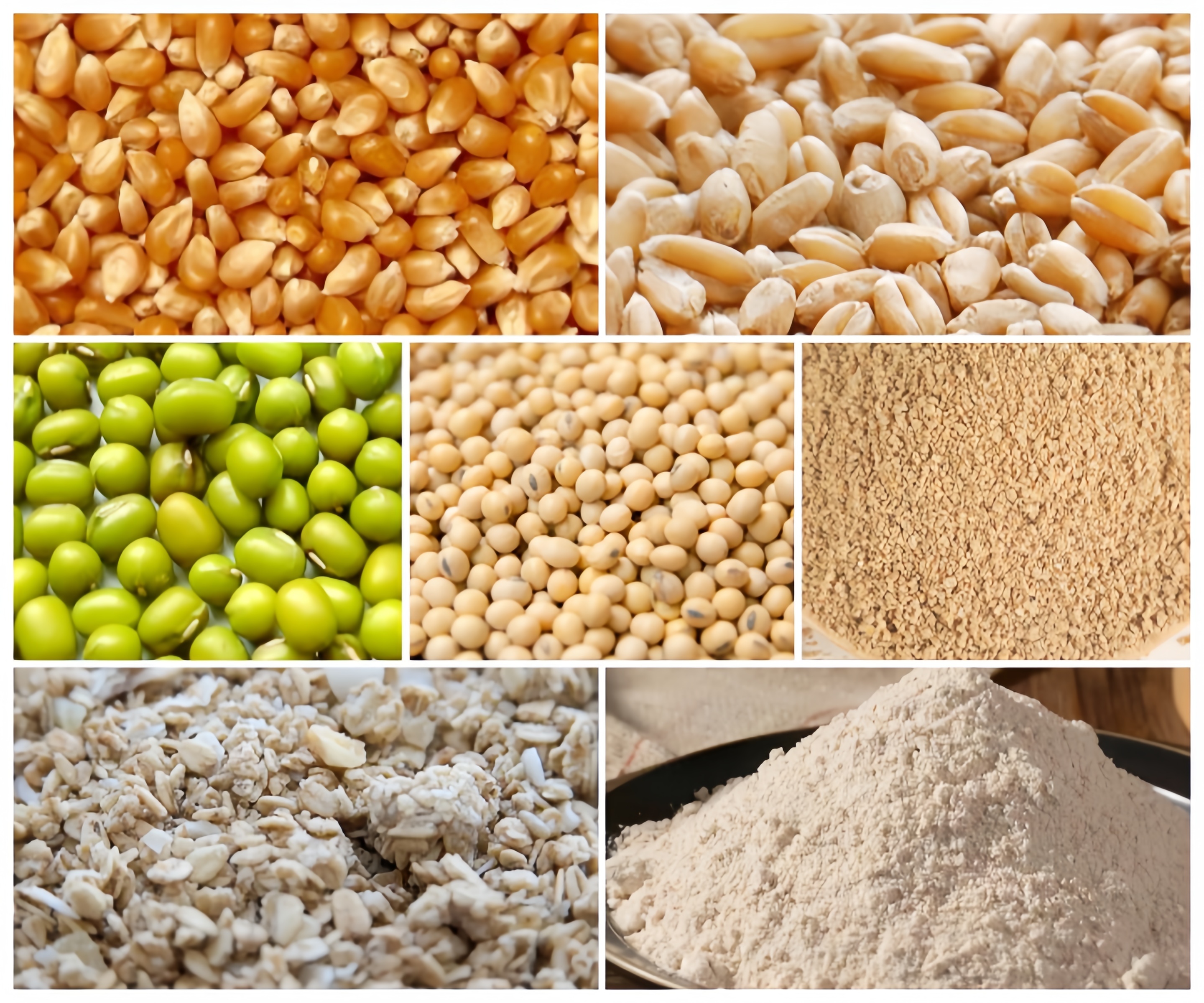 | Basic Energy | Protein Raw Materials | Corn, sorghum, oats, barley, wheat, soybean meal, rapeseed meal, cottonseed meal, wheat bran, etc. | Constitutes the main body of feed, providing primary energy and protein. |