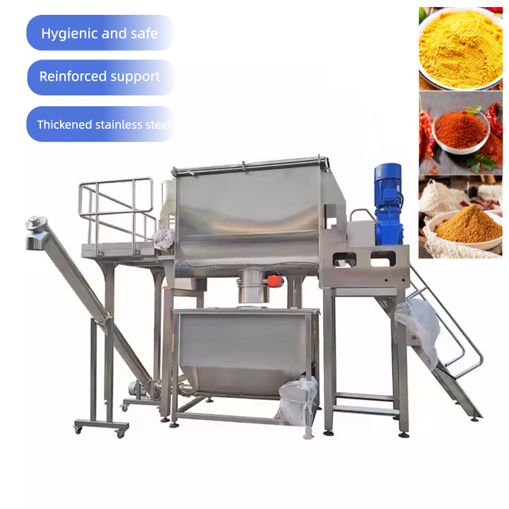 For conventional powdered and granular spices:for dry chili powder, peppercorns, and cinnamon bark, even with significant differences in fluidity, the forward push and reverse tumbling motion of the ribbon ensures effective mixing, making it suitable for most basic spice processing needs.