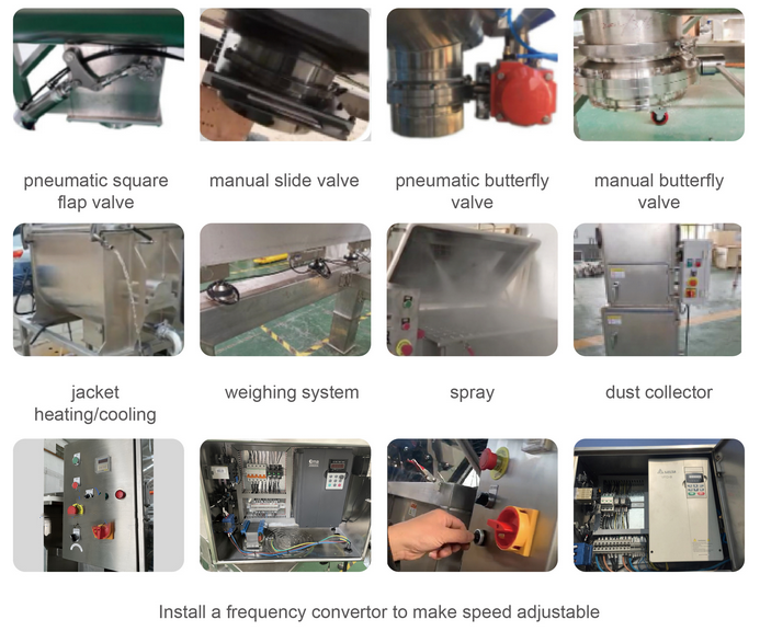 The Vertical Powder Ribbon Mixer for Solids and Powders can be equipped with a variety of additional functions to further expand its adaptability and improve mixing quality. Core additional functions are designed around pressure control, temperature regulation, and ease of operation, precisely matching the process requirements of different industries.