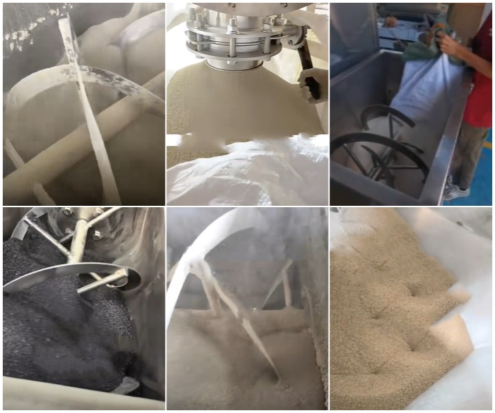 Bentonite Cat Litter Factory: To expand production capacity to handle e-commerce orders, their existing equipment suffered from low mixing efficiency and severe dust pollution. The system incorporates a 1000L double-ribbon mixer, paired with a screw conveyor and pulse dust collector, to achieve automatic raw material conveying and dust collection. The equipment uses a thickened stainless steel cavity and wear-resistant ribbons to resist bentonite abrasion, achieving a 99% mixing uniformity and ensuring stable absorbency of the cat litter. Variable frequency speed control adapts to different mesh sizes of bentonite, preventing over-grinding. The entire system reduces single-batch mixing time to 5 minutes, increasing daily output from 3 tons to 8 tons.